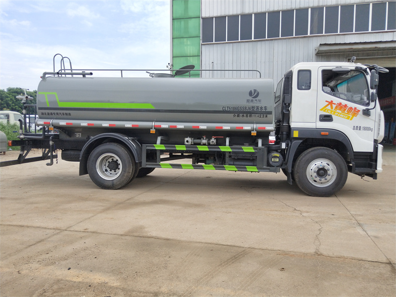 三.產品主要技術參數 序號 名稱 型號、規格 1 整車型號 CLT5188GPSEQ6B 型綠化噴灑車 2 發動機型號 YCS04200-68 3 發動機馬力/功率 玉柴 200 馬力/147KW 4 發動機排量 4156ML 5 變速箱 法士特 8 檔(帶高低速) 6 輪胎規格 10.00 鋼絲胎 7 軸距 3950 8 總質量 18000KG 9 整備質量 6300KG 10 額定載質量 11505KG 11 整車尺寸(長×寬×高) 7.45*2.5*3.2 12 罐體容積 12 方 13 燃料種類 柴油 14 排放標準 國六 15 水泵型號 60/90 16 罐體材質 Q235 碳鋼. 產品功能展示 前沖鴨嘴 后灑 后對沖 高炮 高位花灑 側噴