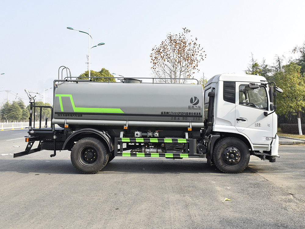 東風天錦 12 噸灑水車整車型號 CLT5161GPSDF6 型綠化噴灑車 2 發動機型號 DDi47E210-60 3 發動機馬力/功率 龍擎 210 馬力/154KW 4 發動機排量 4750ML 5 變速箱 法士特 8 檔(帶高低檔) 6 輪胎規格 9.00 鋼絲胎 7 軸距 3950 8 總質量 16200KG 9 整備質量 6300KG 10 額定載質量 9705KG 11 整車尺寸(長×寬×高) 7.8*2.5*3.2 12 罐體容積 12 方 13 燃料種類 柴油 14 排放標準 國六 15 水泵型號 60/90 16 罐體材質 Q235 碳鋼