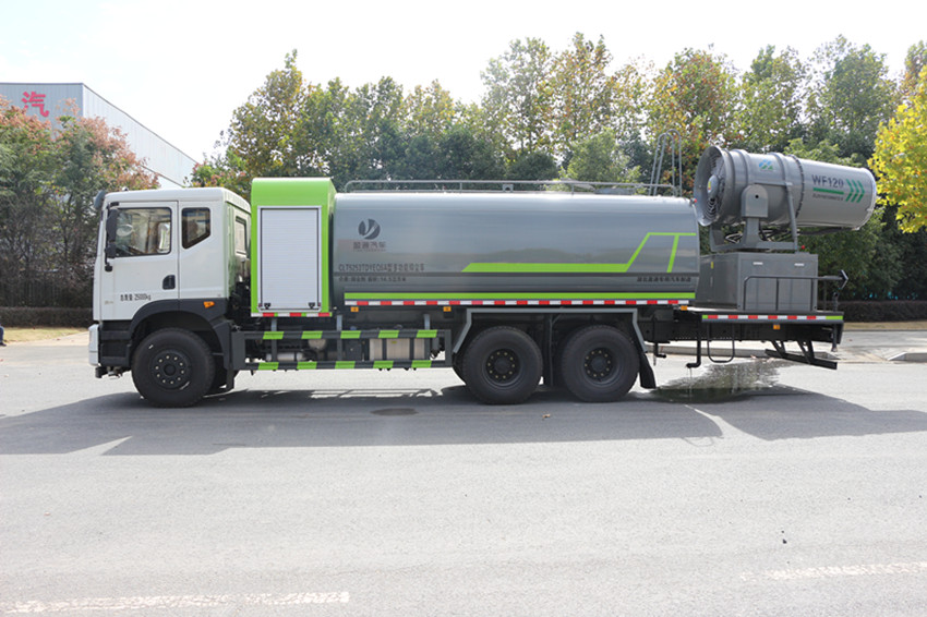 東風17方大型霧炮灑水車整車型號 CLT5253TDYEQ6A 型多功能抑塵車 2 發動機型號 YCS06270-60 3 發動機馬力/功率 玉柴 270 馬力/199KW 4 發動機排量 6234ML 5 變速箱 法士特 8 檔(帶高低檔) 6 輪胎規格 11.00 鋼絲胎 7 軸距 4350+1350 8 總質量 25000KG 9 整備質量 13600KG 10 額定載質量 11205KG 11 整車尺寸(長×寬×高) 10.54*2.5*3.8 12 罐體容積 17 方 13 燃料種類 柴油 14 排放標準 國六 15 水泵型號 60/90 16 罐體材質 Q235 碳鋼