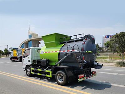 東風小多利卡餐廚垃圾車改裝容積4~5m3,罐體厚度4.75mm,配備掛桶提升機構,后蓋液壓開啟,罐體可以舉升自卸,尾部帶自流閥。