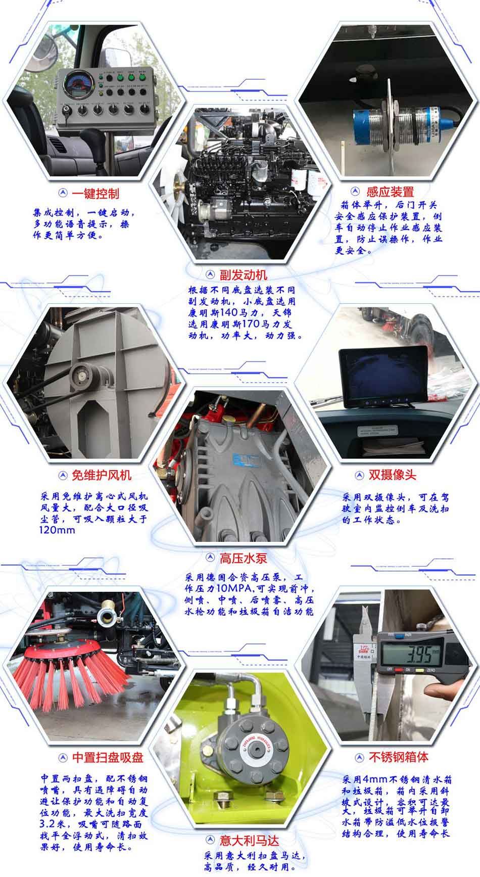 東風D9洗掃車上裝配置:帶不銹鋼箱體,容積為9立方,帶2個中置掃盤,康明斯170馬力副發動機;意大利馬達;德國高壓水泵(前沖/側噴/中噴/后噴霧/沖洗水槍/垃圾箱自潔裝置);萬向高壓路沿清洗噴頭,威龍低壓泵(前沖);不銹鋼垃圾箱;不銹鋼管高壓管路;德國控制器;韓國控制箱;PLC一鍵控制;尾部LED箭頭燈;機油、垃圾箱、水箱均帶防溢低水位報警裝置;倒車及洗掃狀態室內監視器。18m高壓沖洗卷盤。清掃寬度3.5m;清洗壓力10MPa;吸入粒度φ110mm。
