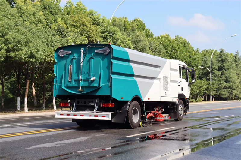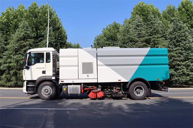 9、掃路車,清掃車,洗掃車,除塵過濾系統設置三級氣力輸送除塵裝置。濾筒式過濾系統采用脈沖式除塵。除塵系統中設有氣壓開關進行壓差控制實現脈沖自動除塵;