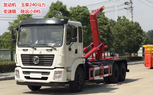 東風(fēng)后雙橋勾臂式垃圾車,齊星駕駛室,玉柴240馬力發(fā)動機(jī),陜齒小8檔變速箱,軸距4350+1300輪胎,前橋5噸,后雙10噸,11.00R20鋼絲胎,帶ABS,下防護(hù)。