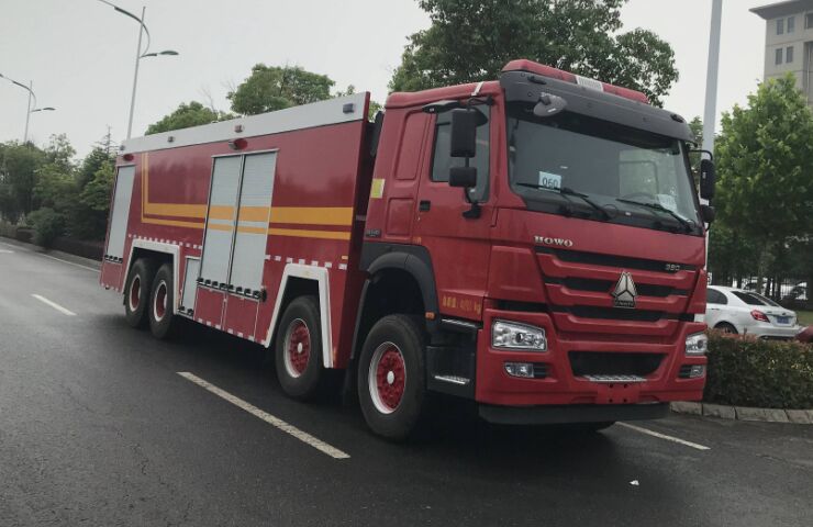 重汽豪沃24噸泡沫消防車,采用重汽豪沃ZZ5437V4667E1底盤改裝而成。整車由消防員乘員室和車身兩大部分組成,乘員室為一排半,可乘坐2人,該車為外露罐結構,車身前部為水罐,后部為泵房。載液罐體為優質碳鋼,與底盤采用彈性連接,載水20450kg(PM160),泡沫液量3100kg(PM240),裝備了上海茸申消防器材有限公司生產CB10/80型常壓消防泵,額定流量80L/S,車頂安裝成都威斯特消防機械有限公司生產的PL64(PM240)型車用消防炮。該車最大的特點是載液量大、操控性好、維修簡便。可廣泛應用于公安消防隊、廠礦企業及社區、碼頭等場所,撲救大型油脂類火災或一般性性物質火災。