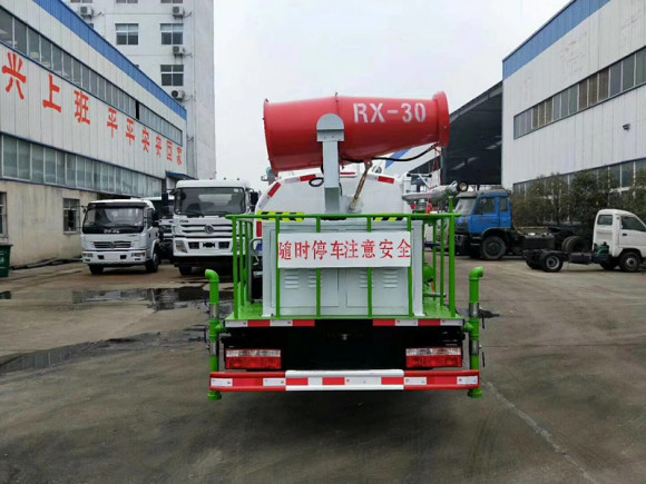 國六東風東風多利卡灑水車專用功能為:前沖后灑,側噴,罐體后帶工作平臺加護欄,平臺上安裝綠化灑水高炮,射程28米左右,可調節多種形態(大雨、中雨、霧狀),配備大功率專用灑水泵,泵可吸自排,帶自流閥,帶消防接頭,帶過濾裝置,兩根吸水管。另外該車可選裝A、后部帶弧形噴霧和LED箭頭指示燈;B、后部帶LED箭頭指示燈;C、后部帶弧形噴霧裝置。