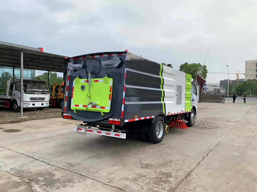 東風多利卡洗掃車采用洗,掃,吸,混合的方式收集垃圾,濕式除塵、電液PLC一鍵控制,液壓傾翻卸料的作業方式對路面進行清掃作業。